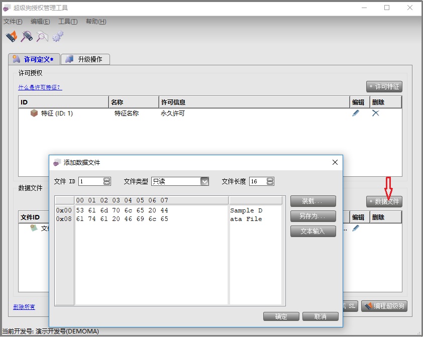 點(diǎn)擊“數(shù)據(jù)文件”添加,數(shù)據(jù)文件支持只讀、讀寫和寫一次三種方式,文件長度最多不能超過1024字節(jié)。添加完以后按確定保存。