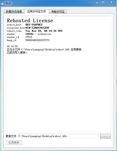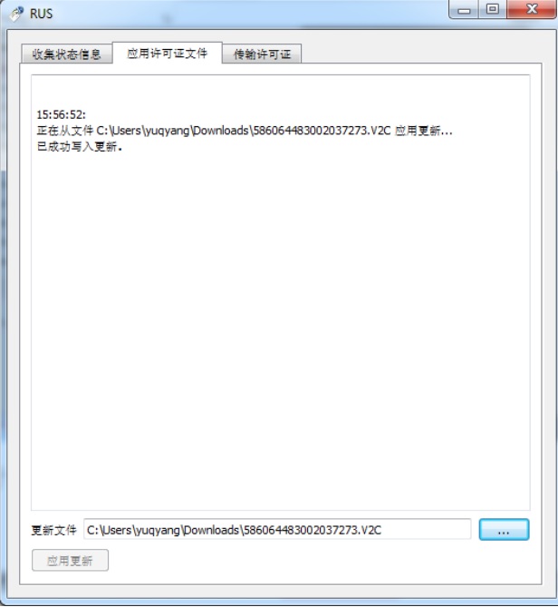 在B電腦上,運(yùn)行RUS,如下邊截圖,應(yīng)用許可證文件 rehost.h2h,點(diǎn)擊左下角按鈕“應(yīng)用更新”即可。