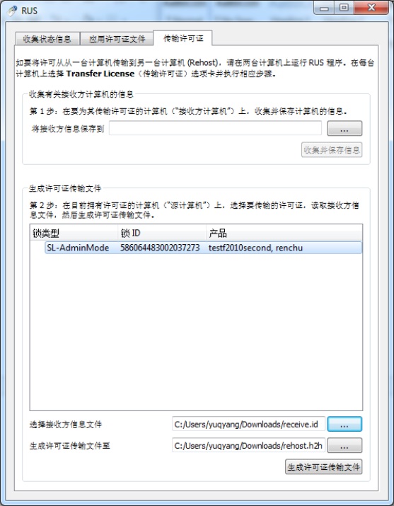 在 A 電腦上,同樣運(yùn)行RUS,選擇需要Rehost遷移的SL,“選擇接收方信息文件” 選擇 B 電腦上生成的receive.id;“生成許可證傳輸文件至” 選擇一個(gè)自定義的名字,比如為 rehost.h2h。點(diǎn)擊右下角的按鈕“生成許可證傳輸文件”即可生成rehost.h2h。將這個(gè) rehost.h2h文件發(fā)給B電腦。