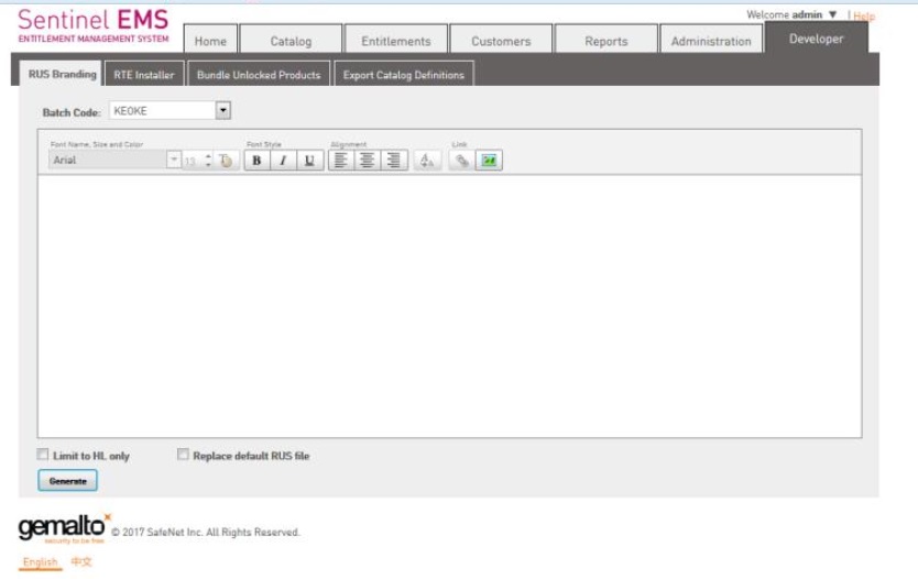 去開發(fā)電腦上打開 EMS,進(jìn)入 Developer 標(biāo)簽頁,可以看到RUS Branding標(biāo)簽頁, BatchCode選擇你的正式號(hào)(比如截圖中的 KEOKE),插上主鎖,點(diǎn)擊左下角的 Generate,就可以產(chǎn)生正式號(hào)對應(yīng)的 RUS 遠(yuǎn)程升級(jí)工具。