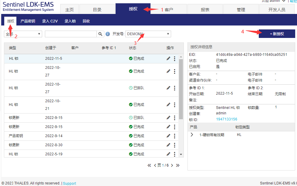 請按圖示步驟選擇1目錄,2授權(quán),3開發(fā)號,4新授權(quán),其中開發(fā)號是對應(yīng)5個字母的主鎖開發(fā)號,測試用戶請選擇DEMOMA